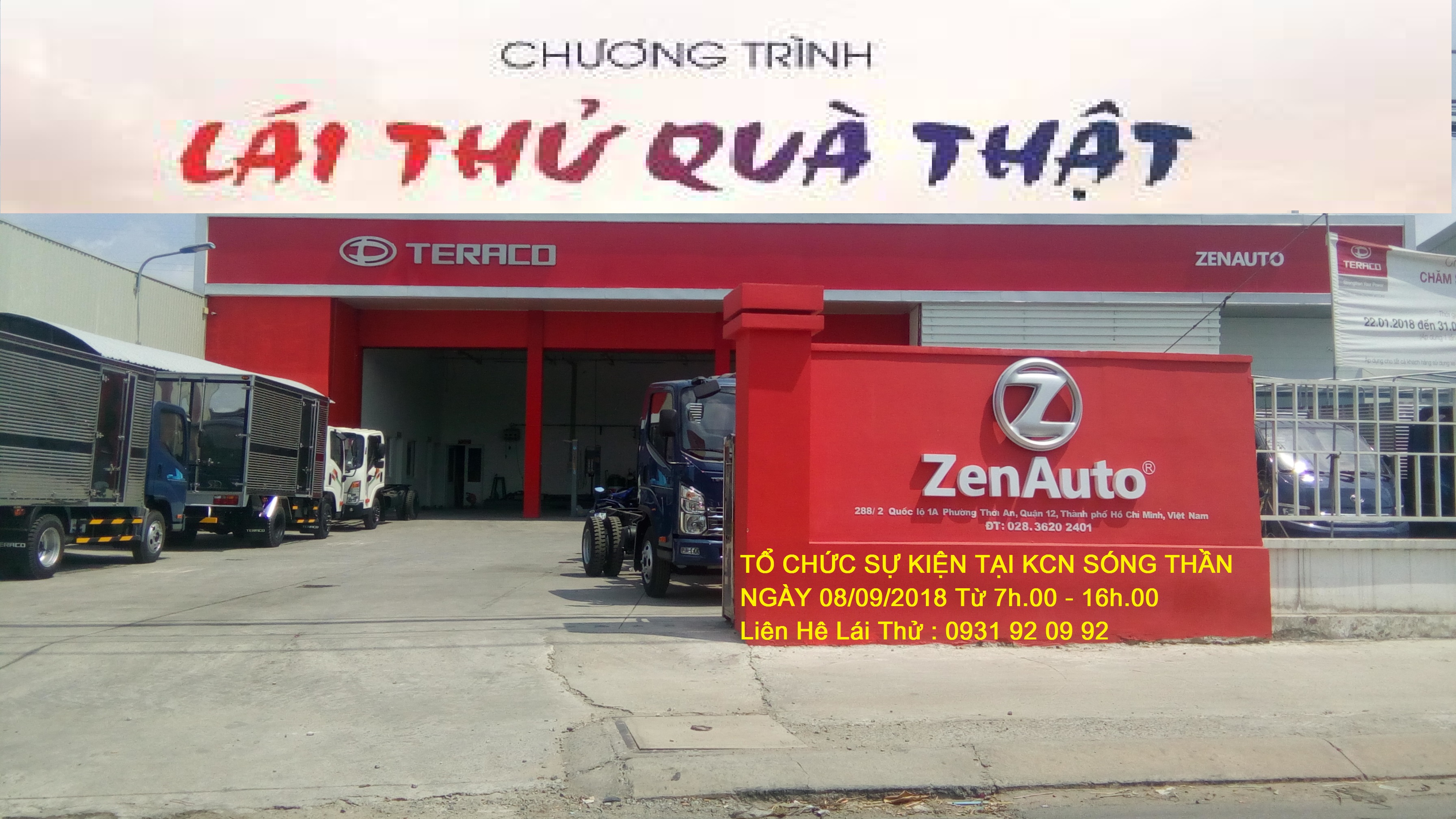 Đại Diện cho Teraco Việt Nam khu vực Phía Nam, Zenauto ( Đại lý ủy quyền 3S) Tại địa chỉ : 288/2 Quốc Lộ 1A, P. Thới An, Quận 12 sẽ tổ chức lễ Trưng bày và Lái Thử Xe tại Trung Tâm KCN Sóng Thần - Dĩ An - Bình Dương vào ngày 08/09/2018 Với nội dung sau: