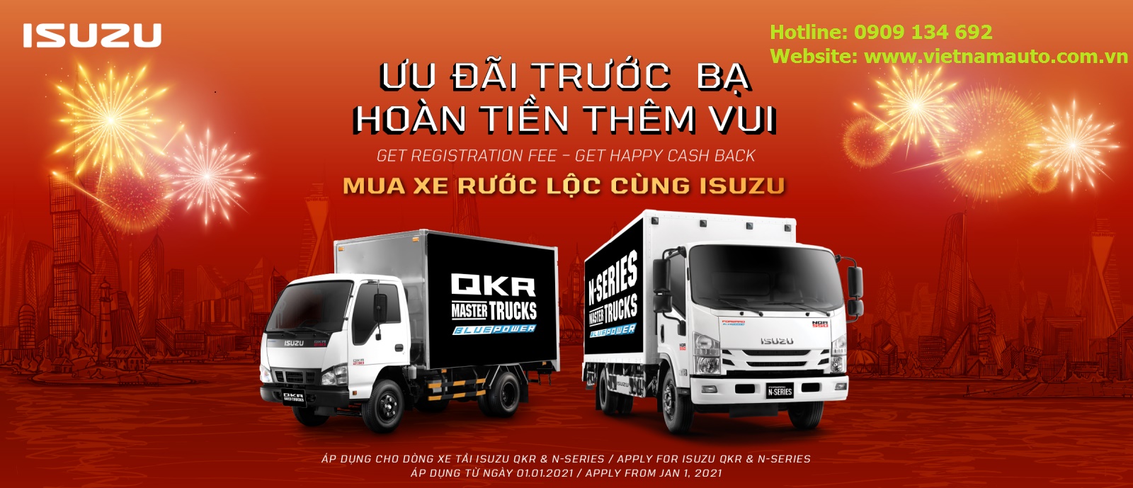 Từ ngày 01/01/2021 đến ngày 30/04/2021, Isuzu Tấn Phát cùng với hệ thống Đại lý Isuzu kinh doanh các dòng xe tải trên toàn quốc thực hiện chương trình khuyến mãi: “ƯU ĐÃI TRƯỚC BẠ – NIỀM VUI GẤP BỘI” dành riêng cho khách hàng mua xe tải Isuzu (áp dụng cho model xe đề cập dưới đây).